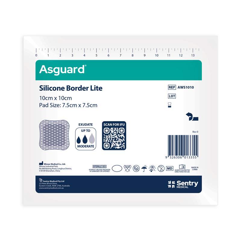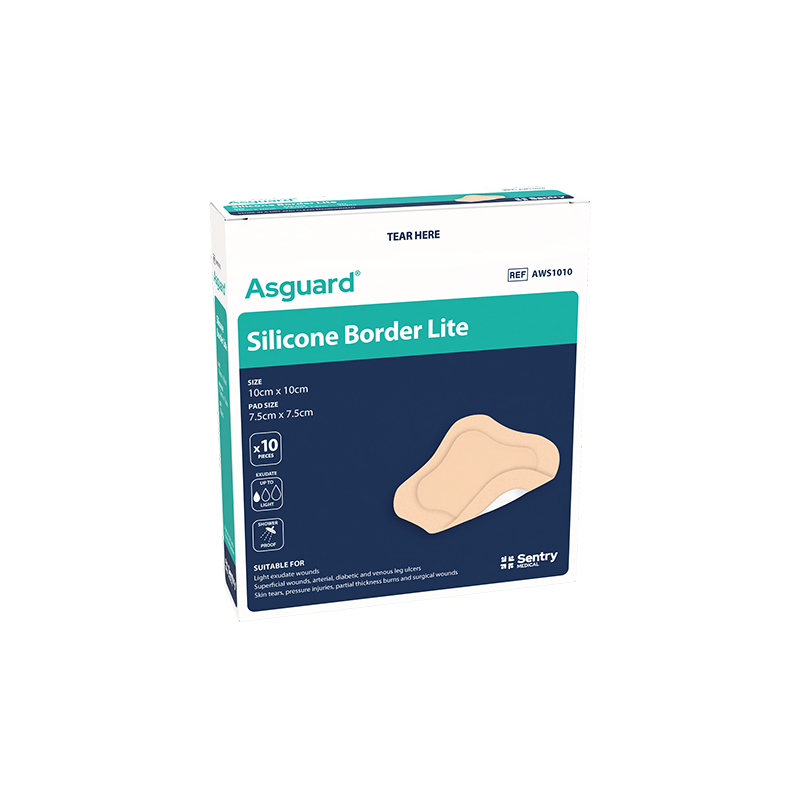 Silicone foam lite dressing with border (Type 11) is indicated for wound management on shallow, granulating wounds, acute and chronic exudative wounds, full and partial thickness wounds (such as pressure ulcers, leg ulcers, diabetic foot ulcers, surgical wounds, first and second degree burns, donor sites, skin tears). It can also be used for the prevention of medical device related pressure injuries on intact skin, as part of a pressure injury prevention protocol.